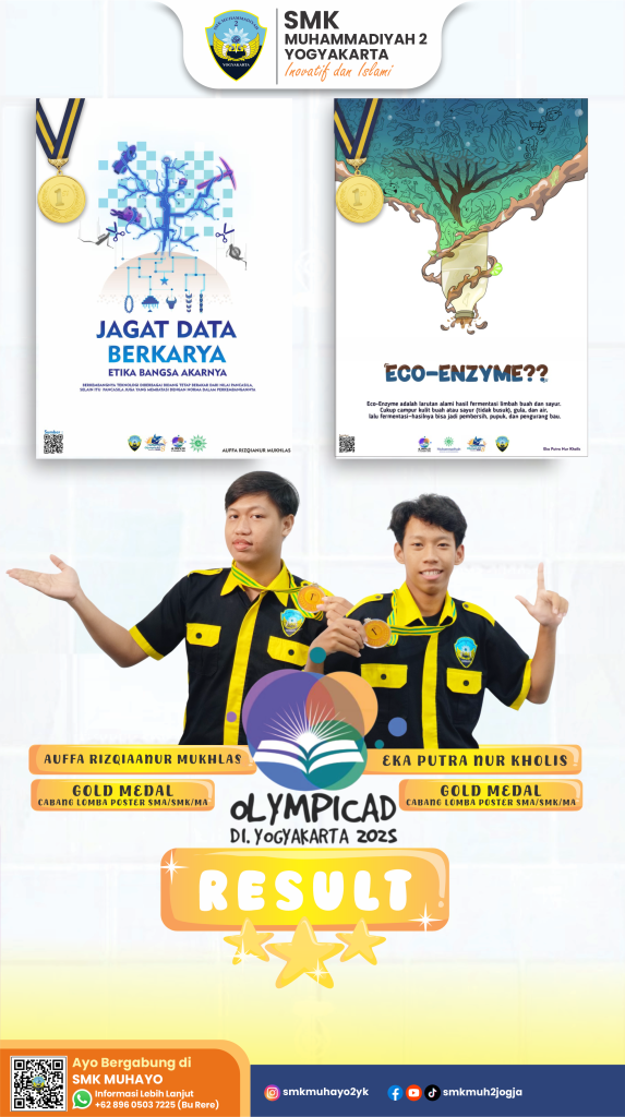 Prestasi membanggakan kembali ditorehkan oleh siswa SMK Muhammadiyah 2 Yogyakarta. Dua perwakilan terbaik kami, Aufa Rizqiaanur Mukhlas dan Eka Putra Nur Kholis, berhasil meraih Gold Medal dalam ajang OLYMPICAD 2025 Yogyakarta pada cabang lomba Poster SMA/SMK/MA. Keberhasilan ini menjadi bukti bahwa kreativitas, ketekunan, dan kemampuan berpikir inovatif para siswa terus berkembang dan mampu bersaing di tingkat regional maupun nasional.